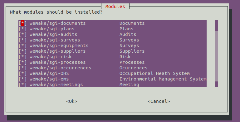 Modules to install: wemake/sgi-documents wemake/sgi-plans wemake/sgi-audits wemake/sgi-surveys wemake/sgi-equipments wemake/sgi-suppliers wemake/sgi-risk wemake/sgi-processes wemake/sgi-occurrences wemake/sgi-OHS wemake/sgi-ems wemake/sgi-meetings wemake/sgi-occupational-health wemake/sgi-training