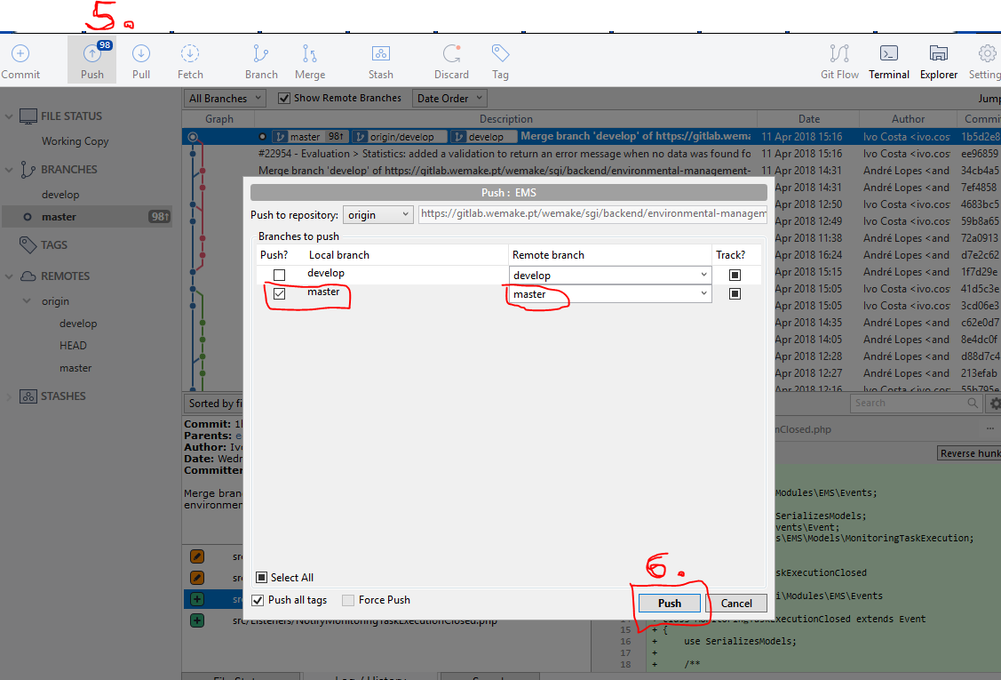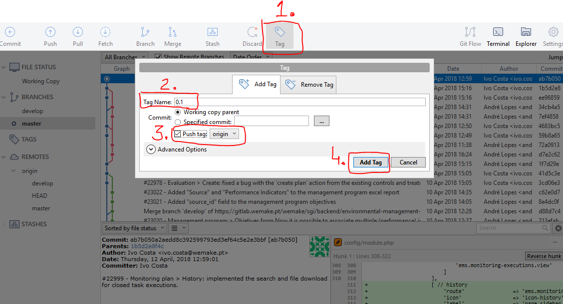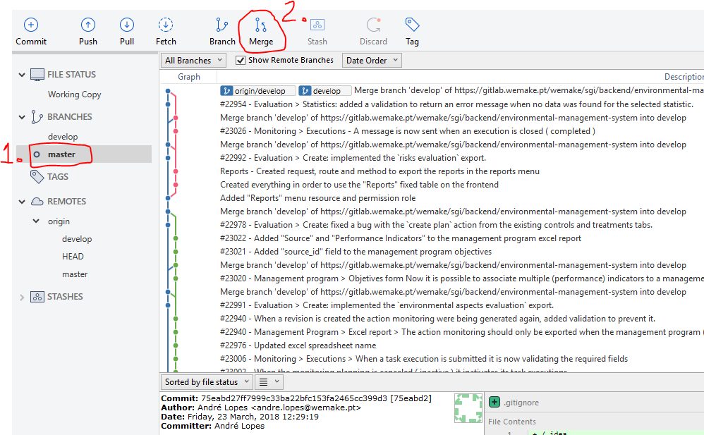 In first place we need to merge de development branches of the modules we want to release into the corresponding master branches. In order to do that we can use the SourceTree git client.