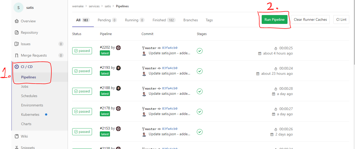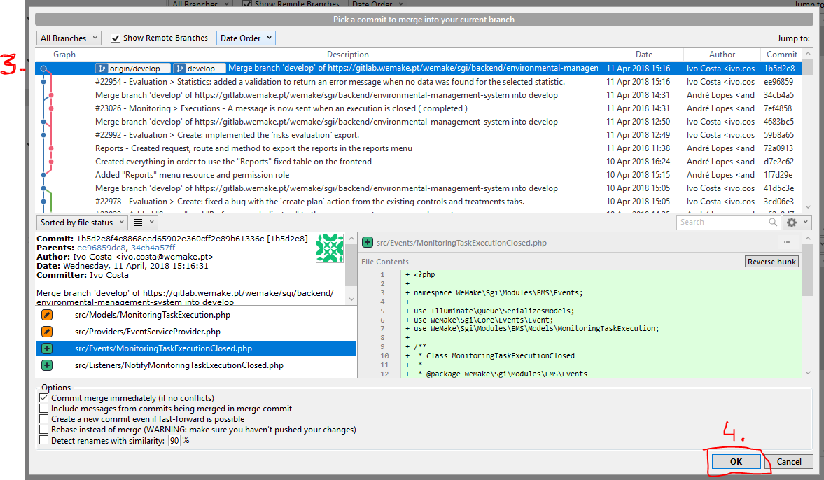 Select the line corresponding to the commit we want to merge into the master branch, usually it will be first (top) line.