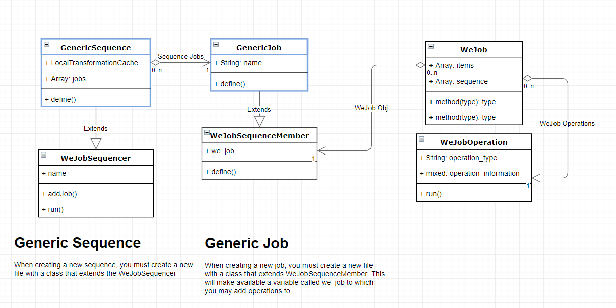 As you can see in the chart above, all the programmer needs to do is to create one sequence (extending the class WeJobSequencer) and as many jobs as are needed to complete the migration (extending the class WeJobSequenceMember). Note that the Jobs created by extending the class WeJobSequenceMember will have the variable $this->we_job available for adding operations to.