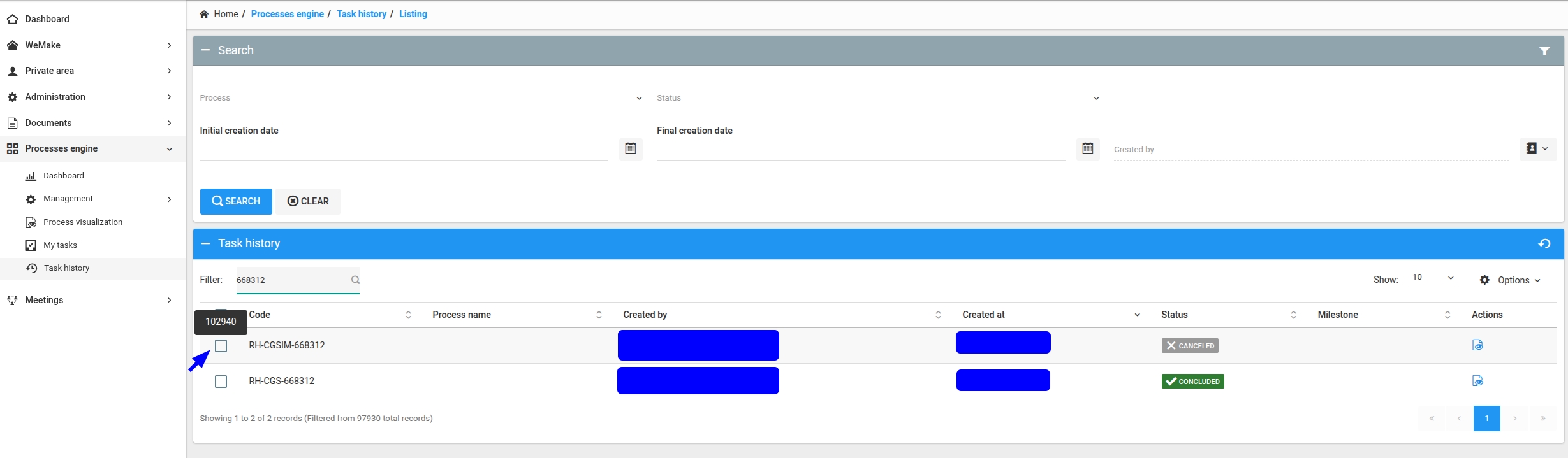 Note: the search may not always work with the simple filter and you might have to travel manually through the pages (use 100 records).
