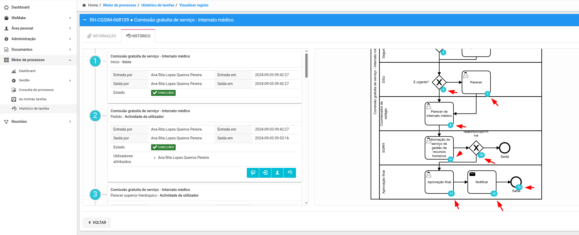 In this case, if we wanted to revert the process to step 8 "Parecer de internato médico", we'd need to change the status_id of that step 1 (executing) and delete the following steps.